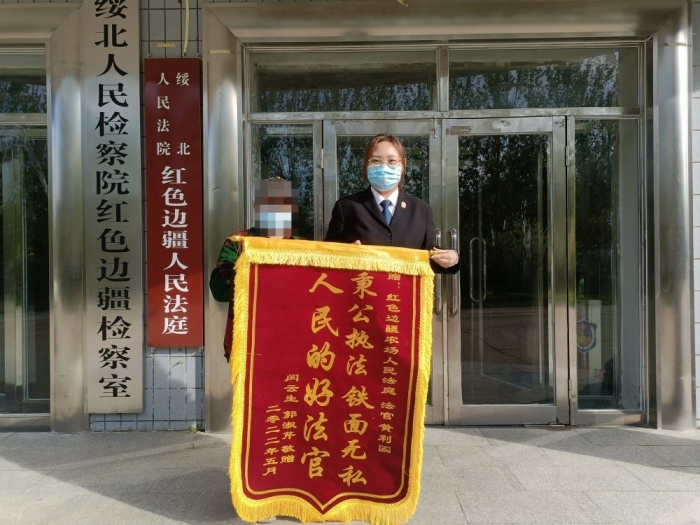 为表达对法庭速裁团队的肯定与感谢,调解结束后,郭大妈特意为红色边疆法庭干警送来一面锦旗。